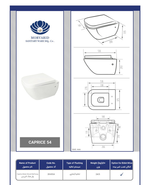 کاپریس از نوع توالت فرنگی وال هنگ (دیواری) یکی از محصولات با کیفیت شرکت چینی بهداشتی مروارید است که با ویژگی 536length mm تولید می شود